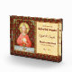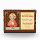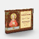 For 1st Communicants + In this splendid image, Jesus sits at a table that is set for Passover and covered in a blue and white plaid cloth. He is clad in an eye-catching, soft red garment. It is Maundy or Holy Thursday and His Last Supper with His apostles. It is the moment at which He institutes the sacrament of Holy Communion or the Eucharist. + The figure of Jesus is isolated against a dark red background patterned with stylised artichokes in diamond shapes. The mood here is solemn. Lifting his eyes to heaven, Jesus raises his right hand in blessing. In his left, He holds up a large host, the Eucharistic bread, over the chalice filled with wine. In Latin--in a banderole beneath the scene--are the words of Consecration: “This is My Body… This is My Blood” (“Hoc est corpus meum… Hic est sanguis meus”). In remembrance of Him, at every Mass, the priest reenacts this sacred action turning ordinary bread and wine into Christ’s Body and Blood. + Image Credit (SAU 045): Antique devotional print of Jesus Instituting the Holy Eucharist, originally published in chromolithography by the Socièté de St. Augustin, Bruges, Belgium, late 19th century, from the designer’s private collection of religious ephemera.
