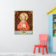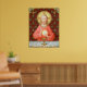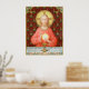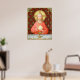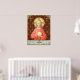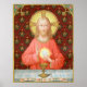 In this splendid image, Jesus sits at a table that is set for Passover and covered in a blue and white plaid cloth. He is clad in an eye-catching, soft red garment. It is Maundy or Holy Thursday and His Last Supper with His apostles. It is the moment at which He institutes the sacrament of Holy Communion or the Eucharist. + The figure of Jesus is isolated against a dark red background patterned with stylized artichokes in diamond shapes. The mood here is solemn. Lifting his eyes to heaven, Jesus raises his right hand in blessing. In his left, He holds up a large host, the Eucharistic bread, over the chalice filled with wine. In Latin--in a banderole beneath the scene--are the words of Consecration: “This is My Body… This is My Blood” (“Hoc est corpus meum… Hic est sanguis meus”). In remembrance of Him, at every Mass, the priest reenacts this sacred action turning ordinary bread and wine into Christ’s Body and Blood. + Image Credit (SAU 045): Antique devotional print of Jesus Instituting the Holy Eucharist, originally published in chromolithography by the Socièté de St. Augustin, Bruges, Belgium, late 19th century, from the designer’s private collection of religious ephemera.