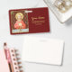 In this splendid image, Jesus sits at a table that is set for Passover and covered in a blue and white plaid cloth. He is clad in an eye-catching, soft red garment. It is Maundy or Holy Thursday and His Last Supper with His apostles. It is the moment at which He institutes the sacrament of Holy Communion or the Eucharist. + The figure of Jesus is isolated against a dark red background patterned with stylised artichokes in diamond shapes. The mood here is solemn. Lifting his eyes to heaven, Jesus raises his right hand in blessing. In his left, He holds up a large host, the Eucharistic bread, over the chalice filled with wine. In Latin--in a banderole beneath the scene--are the words of Consecration: “This is My Body… This is My Blood” (“Hoc est corpus meum… Hic est sanguis meus”). In remembrance of Him, at every Mass, the priest reenacts this sacred action turning ordinary bread and wine into Christ’s Body and Blood. + Image Credit (SAU 045): Antique devotional print of Jesus Instituting the Holy Eucharist, originally published in chromolithography by the Socièté de St. Augustin, Bruges, Belgium, late 19th century, from the designer’s private collection of religious ephemera.