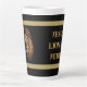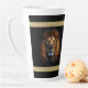 Jesus Lion Of Judah With Lion's Head Latte Mug on a gold and black background. Gold lettering and strips framing the strong Lions Head giving this mug a kingly quality of strength and authority.