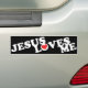 Jesus Loves Me bumper sticker for Christians. Black background, with white text for a bold effect. Red heart in the "o" of loves.