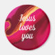 You can personalise this "Jesus Loves You" magnet written in modern elegant white script on a background of a modern red pink and orange swirl. This stylish floral botanical button can be customised with a name or other key word. It can also be ordered in bulk as is for an inexpensive occasions gift. It would be a great gift for trick or treat or halloween or easter. It is meant to encourage children and adults that they are loved by their heavenly Father with an eternal love. See other designs in this Christian expressions and religious sayings collection. Great for a Christian church or religious ladies event, Sunday School gifts, Bible school favours.