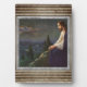 vintage painting of christ sitting on a mountain looking at a city at the bottom of the mountain. catholic image of jesus contemplating as he views a city in the evening.