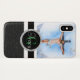 Jesus on The Cross has a place for your name and small square leather patches on the black leather texture with a soft light glow to it with two shinny purple and silver trim and a picture of Jesus hanging on the cross