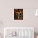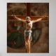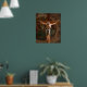 This poster has a wooded cross with Jesus hanging from it and a brown back ground