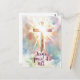 Easter postcard depicts a beautiful watercolor wooden cross with a blue, pink and white abstract background. It features the title to a Christian Hymn, "Jesus paid it all." The greeting, prayer can be personalised or deleted for a hand written message.