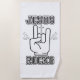 This beach towel has a design that features a Yearbook Outline print font with White letters black outline displaying the phrase "Jesus Rocks" with a rocker hand gesture and flash symbols on each side with a cross above in this faith based bible festival theme. The front of this towel is a polyester blend, the back is 100% cotton with vibrant sublimation printing that is designed to last. Enjoy this towel for your next picnic, beach getaway or any outdoor activity you may attend all towels are machine washable with recommended low speed tumble dry.