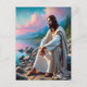 This serene portrayal of Jesus captures a tranquil moment of contemplation by a peaceful coastline. Clothed in flowing robes, He sits thoughtfully on rocky terrain, gazing at the vibrant horizon painted with hues of pink and gold. The gentle waves and rugged landscape create a harmonious backdrop, symbolising both strength and serenity. His expression radiates wisdom and compassion, inviting viewers to reflect on faith, peace, and the beauty of divine creation. This imagery serves as a timeless reminder of Christ's role as a source of comfort, guidance, and spiritual renewal for all who seek His presence.