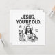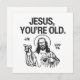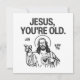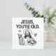 Funny "Jesus, You're Old. Joking. Love ya" birthday design depicts a simple illustration of Jesus smiling and pointing. This cute Christian birthday card makes a nice gift a Christian who likes Jesus and funny birthday designs.