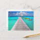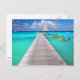Postcard of a wooden jetty with some colourful boats and a thatched hut in the turquoise blue lagoon of the tropical, Pacific island Rangiroa, close to Tahiti and Bora Bora in French Polynesia.