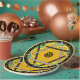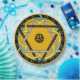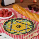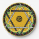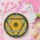 Cheerful original design featuring a a central mandala that intertwines a daffodil yellow flower with a polka dot Star of David all set on a spring green background, a border of red cherries & green leaves against black and a final border of Stangl yellow. Perfect for outdoor parties, the kids table for family get-togethers or luncheon plates.
