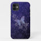 Elegant and stylish butterfly design: floral like swirls, and a butterfly with silk-like wings in shades of blue and lilac, decorated with shiny jewels (Textured - not real !), set on a background of dark blue damask.