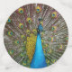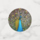 Original artwork of a colourful show off peacock on display. The iridescent tail feathers glow in shades of blue, teal, green, and purple giving this proud bird the appearance of royalty. The vibrant colours of this majestic pea fowl shine in this lifelike art that fills the entire design area. Peacocks are symbols of beauty, grace, majesty, pride, and wealth. Because peacocks are associated with royalty, they are seen as good luck.