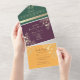Celebrate your love in rich, luxurious style with this jewel-toned all-in-one wedding invitation. Featuring deep plum and emerald green panels, golden floral illustrations, and a detachable RSVP section in marigold yellow, this design is perfect for bold, elegant weddings. The design carries through the jewel-tone palette and floral artwork, adding sophistication and style to every detail.