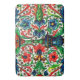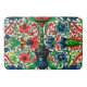 Adapted from a mediaeval manuscript, a parchment illustration of vases, flowers and scrolls in bright jewel tones.