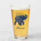 This personalised pint glass or pub glass features an illustration of a jewelled or decorated elephant in royal blue with its trunk raised for good luck. It's ready to be personalised below with a name in matching blue script lettering.