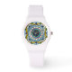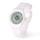 This sporty watch has a white bezel & strap and is beautifully adorned with an original digital painting by Leslie Sigal Javorek inspired by the wonderfully intricate jewellery & mendhi (henna tattoos) designs from India. In shades of blue,turquoise,purples, pearl & gold.
