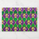 jewellery, background on Mardi Gras of purple and green rhombus, decorated gold lilies.