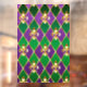 jewellery, background on Mardi Gras of purple and green rhombus, decorated gold lilies.