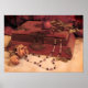 This lovely poster features an old-fashioned jewellery box with a strand of pearls and three dried roses set on a creamy surface. A silk fabric background completes this scene from another time and place in shades of pink, red, cream and brown.