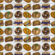 Fabric features original marker illustrations of classic NYC Jewish deli foods, including blueberry blintzes, challah bread, bagel with cream cheese and lox, pastrami sandwich, knish, and marble rye bagel.