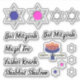 A beautiful sheet of 15 sticky labels. There are 9 Star of David faux silver edged stickers - 5 are plain silver, 2 have a bright pink middle and 2 have a navy blue centre. There are five flowing script templates with the words "Bar Mitzvah", "Bat Mitzvah", "Mazel Tov", "Yasher Koach and "Shabbat Shalom" respectively. The last sticker is a graphic art work of nine red glowing candles in a menorah with the words "happy chanukah" below the candles.