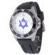 This design features the star of David (✡︎), which is known in Hebrew as the "Shield of David" or "Magen David". It is generally used as a symbol of modern Jewish identity and Judaism. Its has the shape of a hexagram, made up of two equilateral triangles. The identification of the term "Star of David" or "Shield of David" with the hexagram shape dates back to the 17th century.