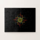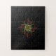 This jigsaw puzzle features a black background with a colourful geometric design in the centre. The design is made up of lines in various colours, creating a unique and eye-catching pattern. This puzzle is perfect for anyone who enjoys challenging their problem-solving skills and appreciates unique designs.