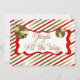 Jingle All the Way Christmas holiday greeting invitation card features a background of red, white, and gold diagonal stripes, old time jingle bells, a red and white banner, and text that reads Jingle All the Way! The back features a small gold bow with two jingle bells with an area you can add your text message and name(s). We have matching postage, stickers, return address labels, and envelopes.