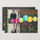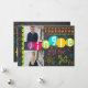 A chalkboard look background with colourful, fun text of pink, green, blue, purple, and yellow with text that reads "Jingle All the Way" on front and "Wishing you a Merry Christmas" on back with a string of tree ornaments, snowflakes of blue, yellow, and purple, and areas you can easily add your names and two photos on a photo card that's sure to get a lot of oohs and aahs this holiday season!