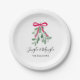 These Christmas party paper plates are decorated with watercolor green mistletoe, a red ribbon, and stylish script typography that says "Jingle And Mingle"