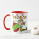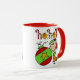 A cute Christmas holiday design features an elf dressed in a red stocking cap and pointy elf shoes resting against a tree ornament ball and candy cane striped text reads Ho Ho Ho on holiday T-shirts, mugs, bags, sweatshirts, keepsakes, buttons, magnets, stickers, and more!