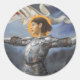 Jeanne d'Arc iconic image in battle, wearing armour and holding sword and banner.