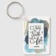 Christian keychain with inspirational quote scripture depicts a modern blue, grey, black and gold abstract watercolor in a trendy art design. It features a portion of Bible Verse John 14:6, in the words of Jesus, "I am the way the truth and the life."