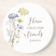 Round sandstone coaster with inspirational quote scripture depicts a beautiful nature watercolor with simple blue and yellow meadow wildflowers. It features a portion of an encouraging Bible Verse John 15:15, in the words of Jesus, "I have called you friends."