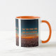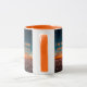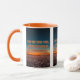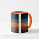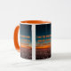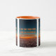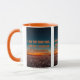 This two-tone mug features a design that has a Norwester print font with dark orange coloured letters grayish outline displaying the "John 15:1" KJV bible scripture verse over this picture showing a large cotton field under a vibrant multi-coloured sky in the background of this faith based theme. This verse is referencing the Book Of John 15th chapter showing the 1st verse in this bible scripture quote theme from the King James bible. The rim & handle are glazed in matching colours available in 11-ounce or 15-ounce sizes microwave and dishwasher safe ceramic construction.