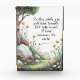In a whimsical fantasy garden, a winding path leads through vibrant blooms. The inscription of John 16:33: "In this world, you will have trouble. But take heart! I have overcome the world." The image invites visitors to reflect, reminding them that challenges are part of the journey, even in a realm of wonder, but hope prevails.