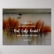 Inspirational Christian scripture poster depicts a nature watercolor painting including a marsh with blue water and reeds. It features a portion of an encouraging Bible Verse John 16:33, in the words of Jesus, "In this world you will have trouble. But take heart! I have overcome the world.”