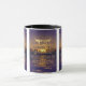 This two-tone mug features a typograph design that has a Loubag print font with purple coloured letters, golden coloured outline displaying the "John 1:17" KJV bible scripture verse over a picture displaying a big yellow moon sunset with stars over a purple tropical sea in this faith based theme. This verse is referencing the Book Of John 1st chapter showing the 17th verse of this bible scripture quote theme from the King James bible. The rim & handle are glazed in matching colours available in 11-ounce or 15-ounce sizes microwave and dishwasher safe ceramic construction.