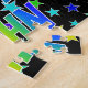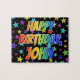 This exciting and fun birthday-themed jigsaw puzzle design features the message "HAPPY BIRTHDAY, JOHN" with the characters having a colourful rainbow spectrum inspired gradient pattern, along with a lively star field background pattern. A colourful puzzle like this might be used to send birthday greetings to somebody named John. [~Z0000468]