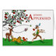 Happy Johnny Appleseed Day, paper greeting card. Card features a cute illustration of Johnny Appleseed leading a menagerie of animals and insects as he spreads apple seeds on the ground. A large apple tree branch loaded with red apples is behind them. Art, image, and verse copyright © Shoaff Ballanger Studios.