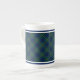 Bone china mug with the Johnston family clan tartan pattern. Traditional vintage Scottish plaid from 1842 in blue and green, with black and yellow accents.