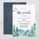 This join us in the woods destination wedding invitation is perfect for an outdoor wedding. The design features a blue and green painted wilderness landscape with watercolor pine trees, birds and mountains.