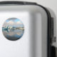 Round souvenir photo magnet with the reflection of clouds and icebergs in Jokulsarlon, glacier lake in Iceland, where icebergs collapsing from Breidamerkurjokull glacier float around.