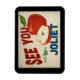 A charming Joliet Illinois vintage travel wall refrigerator magnet featuring a lovely red apple, along with fun retro style text that says, "See you in Joliet"