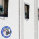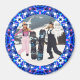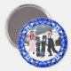 Jolly and Festive Christmas Photo Picture Frame Round Magnet. A colourful and bright circular fridge magnet. The frame design is a geometrical abstraction take on traditional festive designs. In winter colours of blue, pink and white. Replace the photo with your own for a stocking stuffer gift for family and friends to celebrate Christmas. Cherish your Yuletide memories.