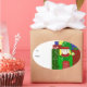 A cute little elf or otherwise known as santa's helper. Dressed in a bright green suit and hat. A large grouping of festively wrapped presents around him. Customise as desired.