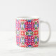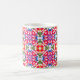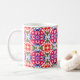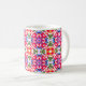 Jolly Christmas Merry Bright Colourful Pretty Tea Coffee Mug. In traditional colours of red and green, with orange, pink and blue. A multicolour pattern for cheerful hot chocolate on cosy nights in. For winter warmer drinks. Budget friendly festive gifts for her.