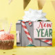 This design features a charming array of holiday elements set against a textured, light grey background that resembles weathered wood.