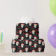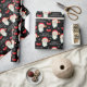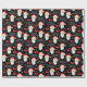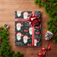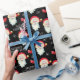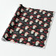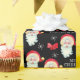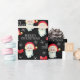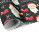 This Christmas gift wrapping paper features a graphic of Santa Claus and is accented with bows and snowflakes on the black background.